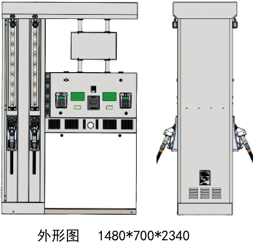 GP03齿轮泵、LL05流量计、自封油枪、电磁阀、防爆电机、塑料枪套、金属软管布线、可拆卸清洗过滤器、冷板机壳、防作弊系统;(3100IC主板、白色背光;6100IC卡主板、分屏显示、斜插式金属键盘)